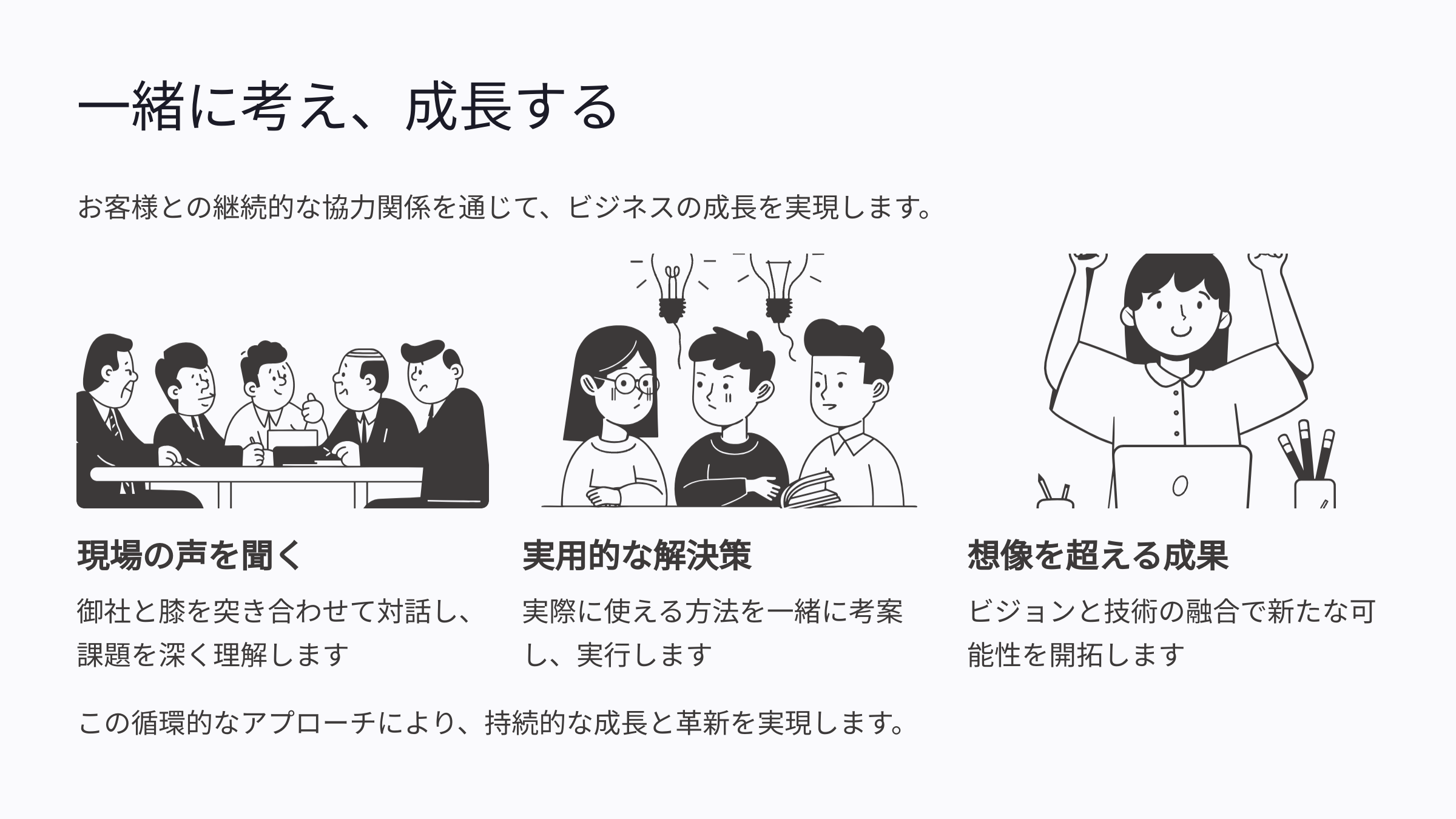 私たちは御社と膝を突き合わせ、現場の声を聞き、実際に使える解決策を一緒に考えます。