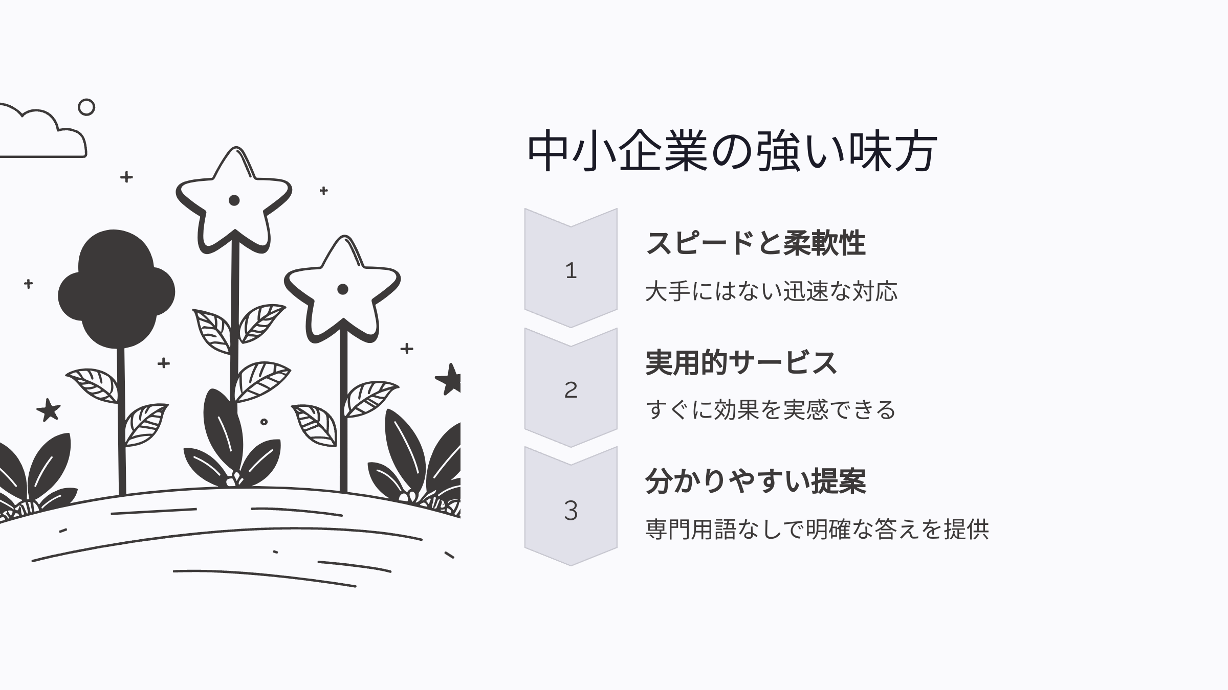 大手が真似できないスピードと柔軟性で、あなたのビジネスを支えます。